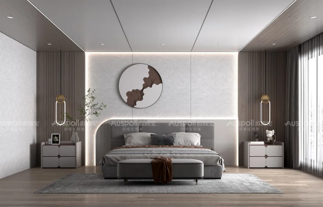 臥室頂墻一體化設(shè)計(jì),通過(guò)墻面和吊頂隔音隔熱性能,為居住者打造了一個(gè)安靜舒適的睡眠環(huán)境。