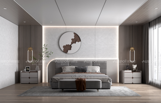 以簡(jiǎn)潔的線條和造型,強(qiáng)調(diào)材料本身的質(zhì)感和色彩。吊頂具備隔絕噪音的功能,用無(wú)主燈加以點(diǎn)綴,打造出高級(jí)感十足的睡眠空間,頂墻一體化,確保整體風(fēng)格的統(tǒng)一,看起來(lái)簡(jiǎn)潔又溫馨。