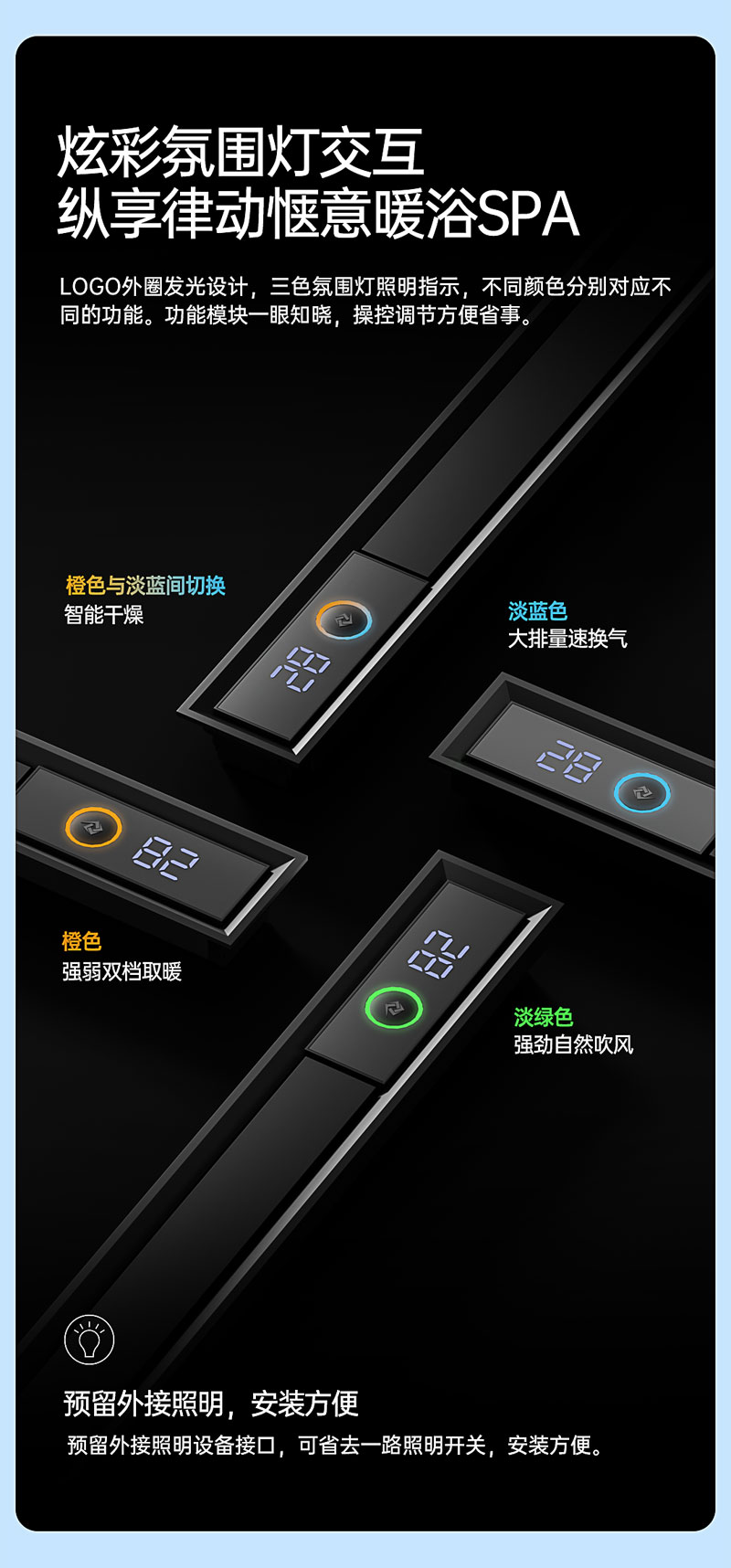 吹風(fēng)、換氣、取暖、智能干燥、氛圍燈、外接照明